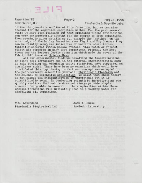 | I am sorry to say I don`t have any of the reports that I received from BLT not that there were that many anyway, we never seemed to get much in return for all the work we did for them. I do remember that the samples that we took from some wind damage and the circle that James and I made that time near Danebury Ring, according to Levengood they were all circle related because they had the so called 'circle energies' in them. James and I had our doubts about the results of several samples sent to Levengood, that is why we wanted to give him some blind samples. What he said about them confirmed our suspicions. We didnt do a lot for BLT after that because we thought we were wasting our time. I am sorry that I have not got any of the crop research papers anymore, they got lost when I moved to North Wales. I am just presuming the boxes got thrown away in the move. Shelley CA Comment: Fortunately I do have a number of them in the Archives. |