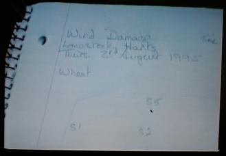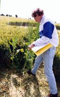 | BLT sampling team remove samples from the normal lodging area on the edge of the wheat field - confirmed by the farmer as lodging after heavy rain washed off the highway (left). Copyright: Colin Andrews |