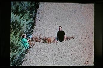 | Colin Andrews interviewing farm foreman Geoff Smith in front of the empty wheat field before the crop circle is made. The small area of normal lodging was less than 100 feet away in the same field. |