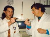| Colin Andrews is not a biologist but has worked with many who are. One such renouned scientist who he has sought advise during the 1990's was Dr. Milton Wainwright - Senior Lecturer, Department of Molecular Biology and Biotechnology, The University Sheffield, UK. Seen here with Dr. Rachel Davey. And below Colin seen with laboratory technician Matt Moniz at Springbourne Labs, MA, USA who was himself working with William Levengood. |