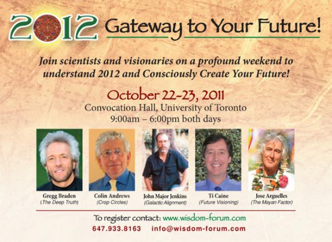 | 2012: Gateway to Your Future October 22-23, 2011 Convocation Hall, University of Toronto ATTEND LIVE OR VIRTUALLY! Hello Friends: Most of you know of me as wearing one of many hats! It could be as the publisher of the Multicultural Calendar, or as a tour organiser taking you to exotic India or Tibet or as the conference organiser for Wisdom-Forum. Thousands of Americans have joined citizens from Madrid to Jerusalem and occupied Wall St., as well as 146 other cities and counting to protest corruption. Changes are happening very quickly and to understand this phenomenon, a GROUNDBREAKING conference is taking place in Toronto called 2012: Gateway to Your Future hosted by Wisdom-Forum. The purpose of this conference is to explore a radically different, more optimistic interpretation of the Mayan prophecy – as referring to the end of the world as we have known it. In addition to predicting a physical destruction of the material world, the Mayan prophecy might refer to death and rebirth and a mass inner transformation of humanity. You will gain incredible new perspectives from the wonderful scientists, experts and visionaries we have gathered for this Conference. ►World renowned scientist and scholar Gregg Braden will share his latest research on four new discoveries that will forever change how we view ourselves. ►Colin Andrews actually coined the term ‘crop circles’, with the latest information on the conscious crop circles. ►A FutureVisioning process led by Ti Caine, a hypnotherapist and futurist will take the audience to meet their future self. ►John Major Jenkins explains how the Mayan Calendar compares to other calendars such as the Vedic, Hopi and Egyptian and its implications ►We will pay a tribute to the late Jose Arguelles who passed away in March. Jose first introduced the date December 21, 2012 into mass consciousness with The Mayan Factor. ► FREE live streamed Meditation with 144,000 attendees from all around the world, meditating together for Global Compassion led by Gregg Braden in collaboration with HeartMath. Imagine people from Japan, India, Japan, Afghanistan, Europe, UK and China joining us with the intention of bringing peace and compassion to our world! Participants will observe world events during the following days to see whether mass positive prayers and intentions do affect change. ►Opening and closing ceremony with Mayan Elders. Early bird tickets are $147 till Oct 10th. After that it will go up to $197. There is special pricing of only $60 for youth under 25. So bring your children for some very important information that will impact their future. Come and be with like-minded people for an amazing experiential week-end of sharing latest discoveries about 2012! Looking forward to seeing you there! Sheena Singh www.wisdom-forum.com info@wisdom-forum.com Phone 647-933-8163 |