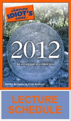 Since Synthia and I wrote the 2012 book for The Complete Idiots Guide Series, these 2012 Debate pages have compiled global events on our planet caused by us humans and also events which have been caused apparently by a higher hand of nature inside and out of our Solar System. These events I broke down into what I called 'support systems' for our planets health, in turn our health and our survival. The trend lines across the whole spectrum have clearly supported the Mayan prediction that we are now entering transition to the Golden age and if we make it, a new age of coherence of love. There seems no productive reason to continue to post the horrible collapse of our infra-structure across these many topics and so at this moment lets simply accept the brilliance of the Maya and gear ourselves to a new approach to life, a new respect, a new way of doing business and caring for this jewel of a planet - Earth. Enjoy what it is we are here to take care of and know this is one struggle we have to wage and to win: God Wonders. It matters not to me whose God you believe in but that we recognise life is a true gift and a blessing we should respect.. Colin Andrews Sept 7, 2011 |