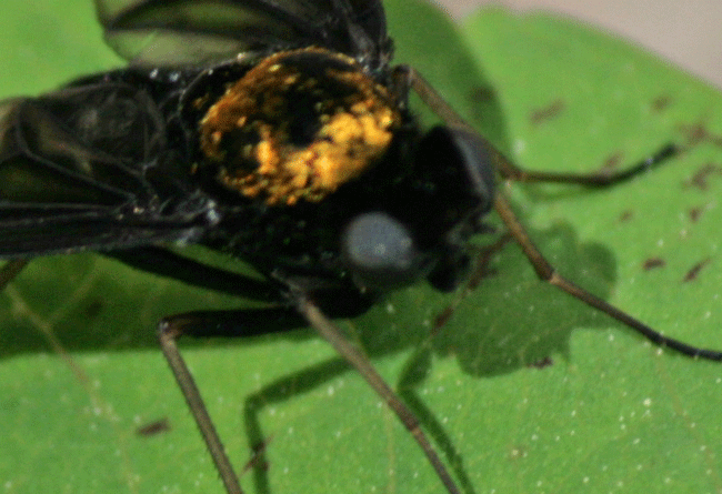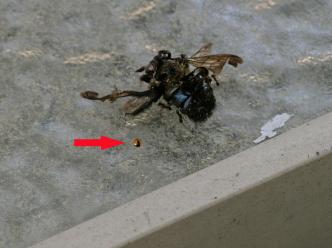 Ants were attracted to the bee within moments of its death and after the scientist had removed the golden object from its head. See similar object on fly (left column) in Nth Guilford, Connecticut June 3, 2011- fact )