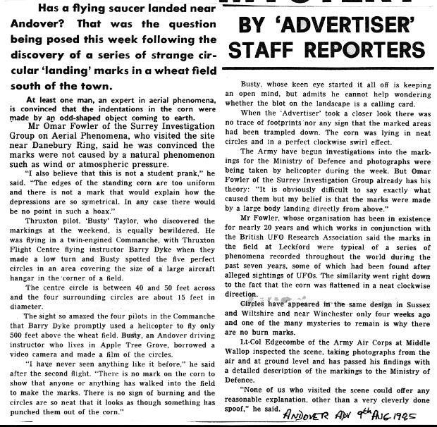 While flying his aircraft south of Andover during the first week of August, 1985, Busty spotted five spectacular circles, forming a cross. His discovery lead to the headlines below, in the Andover Advertiser which caused a major increase in interest, following on the heals of a set of circles I spotted myself a few miles away in 1983. At that time I had not met Busty. |
