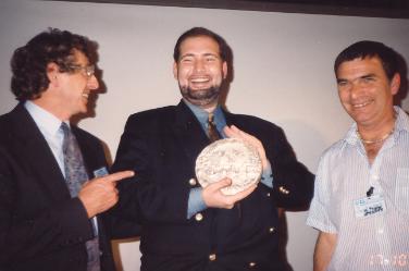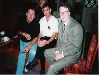 Colin Andrews, Michael Hesemann and Busty in Düsseldorf, Germany. Inspecting the silver and bronze discs discovered at Grasdorf in a crop circle. Right: Reg Presley, Busty and Philip Mantel at the first public screening of the so called Alien Autopsy video in London. The three of us attended both events together. |