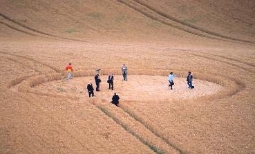 Busty has researched the crop circle subject for nearly three decades. Many would not have been discovered had it not been for his aerial work nor would they have been photographically recorded. Seen here left with Don Tuersley. Center with Kazou Ueno from Japan and dowser Richard Andrews. Right in the Mayan Head-dress crop formation opposite Silbury Hill with Colin Andrews and Maria Wheatley, investigating the claims of a police Sergent to have seen three tall beings at that location. |