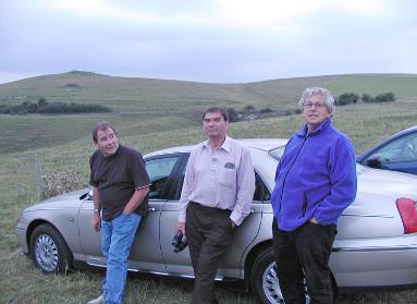 Friends, Reg Presley, Busty and Colin Andrews on a hill top UFO sky watch in Wiltshire, England. |