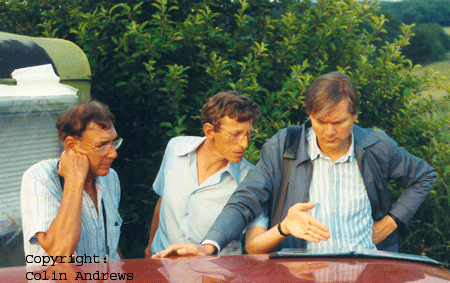 Pat Delgado, Colin Andrews and Timothy Good discuss events at Cheesefoot Head. Copyright: Colin Andrews 1989.