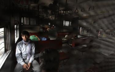 An Indian passenger sits as others sleep inside the compartment of a stationary train following the power outage that struck in the early hours of Monday, July 30, 2012 at a train station in New Delhi, India. A major power outage has struck northern India, plunging cities into darkness and stranding hundreds of thousands of commuters. (AP Photo/Altaf Qadri)