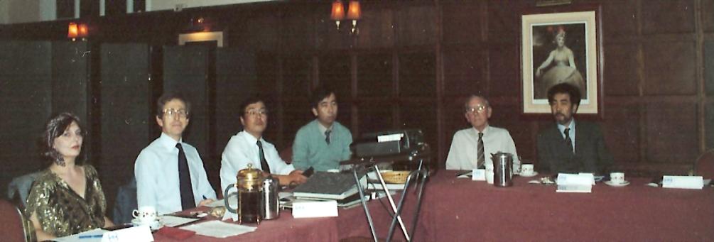 | Colin chairing a meeting with Japanese scientists at a special brain storming session investigating possible relationships between ancient stone circle sites in Japan and crop circles in both countries. 1989, Andover, England. |