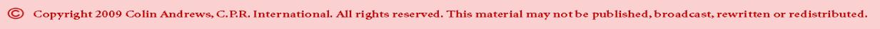 | January 20, 2011 NEW REALITIES RADIO SHOW Exclusive interview with Colin Andrews ahead of his 2009 appearance with Astronaut Edgar Mitchel at the Friends of The Institute Of Noetic Sciences in New York. Colin discusses why he is back and what comes now - Note: During this revealing interview Andrews was cut off the air when discussing a threat he received to remove a document from this website and his presentations. Remain listening as engineers re-establish the connection and continue with the program. Also during the interview Andrews discussed events surrounding a former FBI astrologer who warned of President Reagan attempted assassination. The FBI agent referred to was NOT the agent concerned with the Reagan incident. Colin's statement came out of a misunderstanding and apologizes for that error. Sit Back and Listen to why Andrews is back HERE |