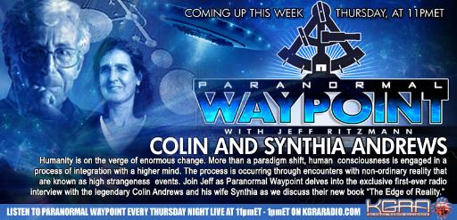 | Other World Radio - Earth Wisdom Series Interview with Dr. Synthia Andrews and Colin Andrews. Their first joint interview and talking about a paranormal experience during which they were unable to move as astounding information was given to them. October 27, 2011 |