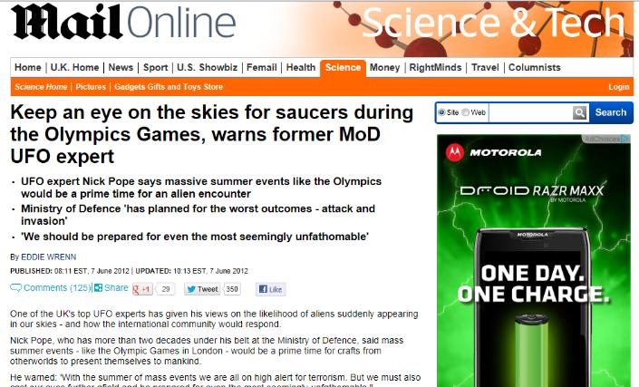 | Colin continues: At first I thought it must be April 1st or Nick had fallen and hit his head. It read: Keep an eye on the skies for saucers during the Olympics Games, warns former MoD UFO expert • UFO expert Nick Pope says massive summer events like the Olympics would be a prime time for an alien encounter • Ministry of Defence 'has planned for the worst outcomes - attack and invasion' • 'We should be prepared for even the most seemingly unfathomable' By Eddie Wrenn The full The Daily Mail article is HERE. |