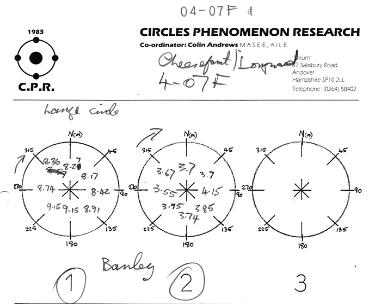 The original hand notes showing the radius measurement taken every 45 degrees from magnetic north. This was our standard procedure for all ground surveys. Each measurement was taken from the beginning or end of the swirl at the center of each circle, to the base of the standing plants on the circumference. Measurement's in metric system (Meters)