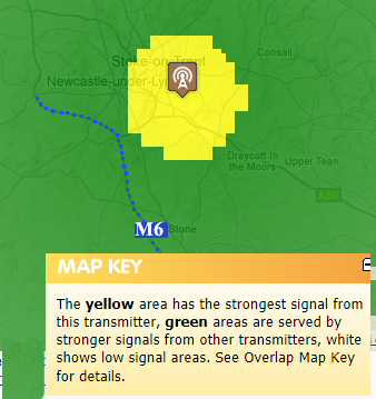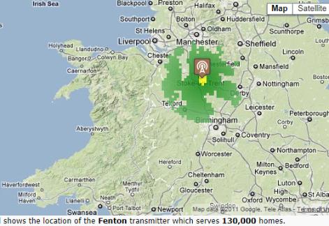 | The Trenton television transmitter near Stoke-on-Trent. Signal Map: Yellow shows strongest