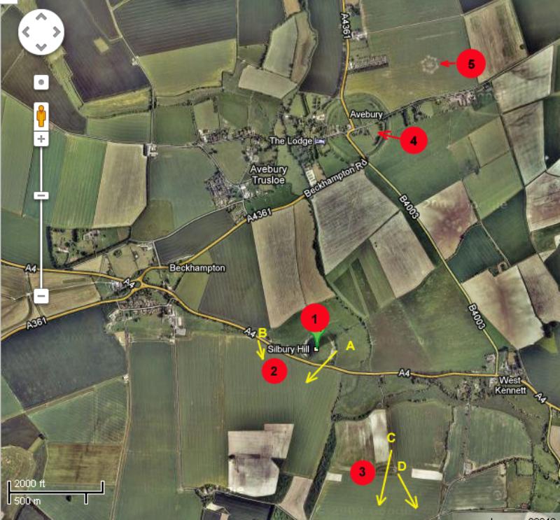 1= Silbury Hill A= Location of Stephen Morris and yellow arrow faces the location of UFO.